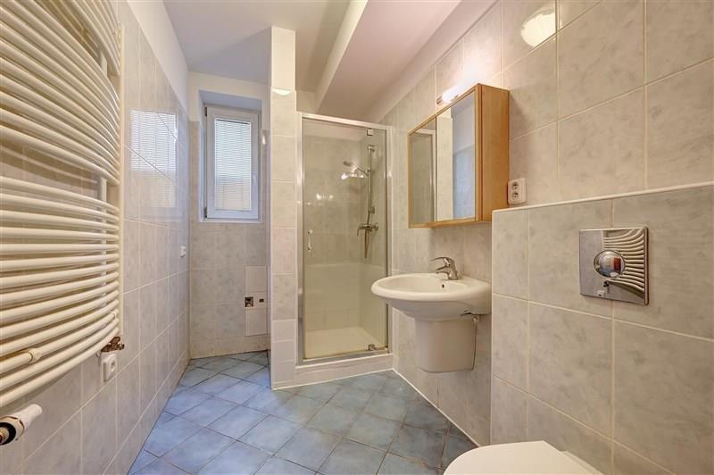Koupelna je se sprchovým koutem, WC v koupelně.