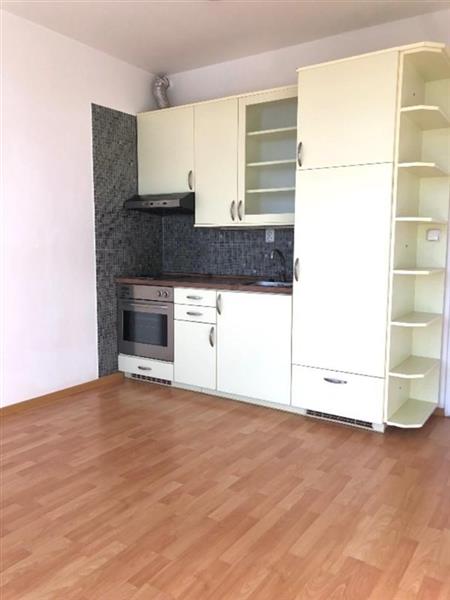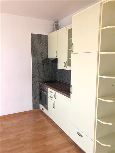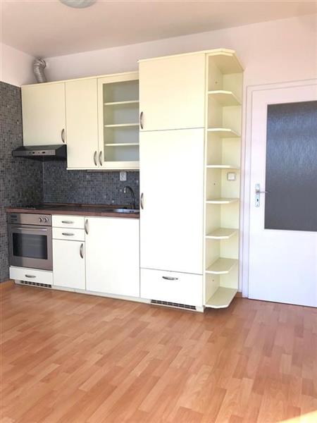 Byt je nezařízen obývací pokoj s kuchyňským koutem je vybaven kuchyňskou linkou se spotřebiči varná deska, trouba, vestavná lednice s mrazákem.