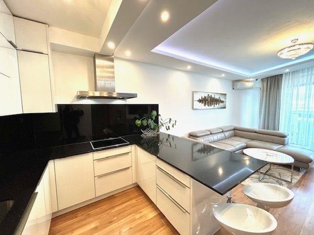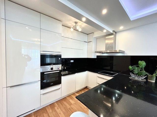 Moderní kuchyňská linka plně vybavena spotřebiči lednice, myčka, indukční varná deska, el. trouba, mikrovlnná trouba.